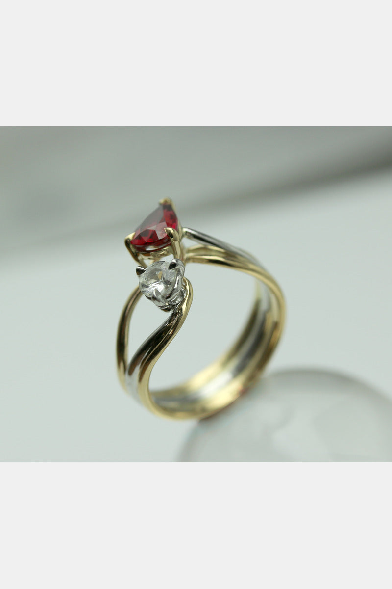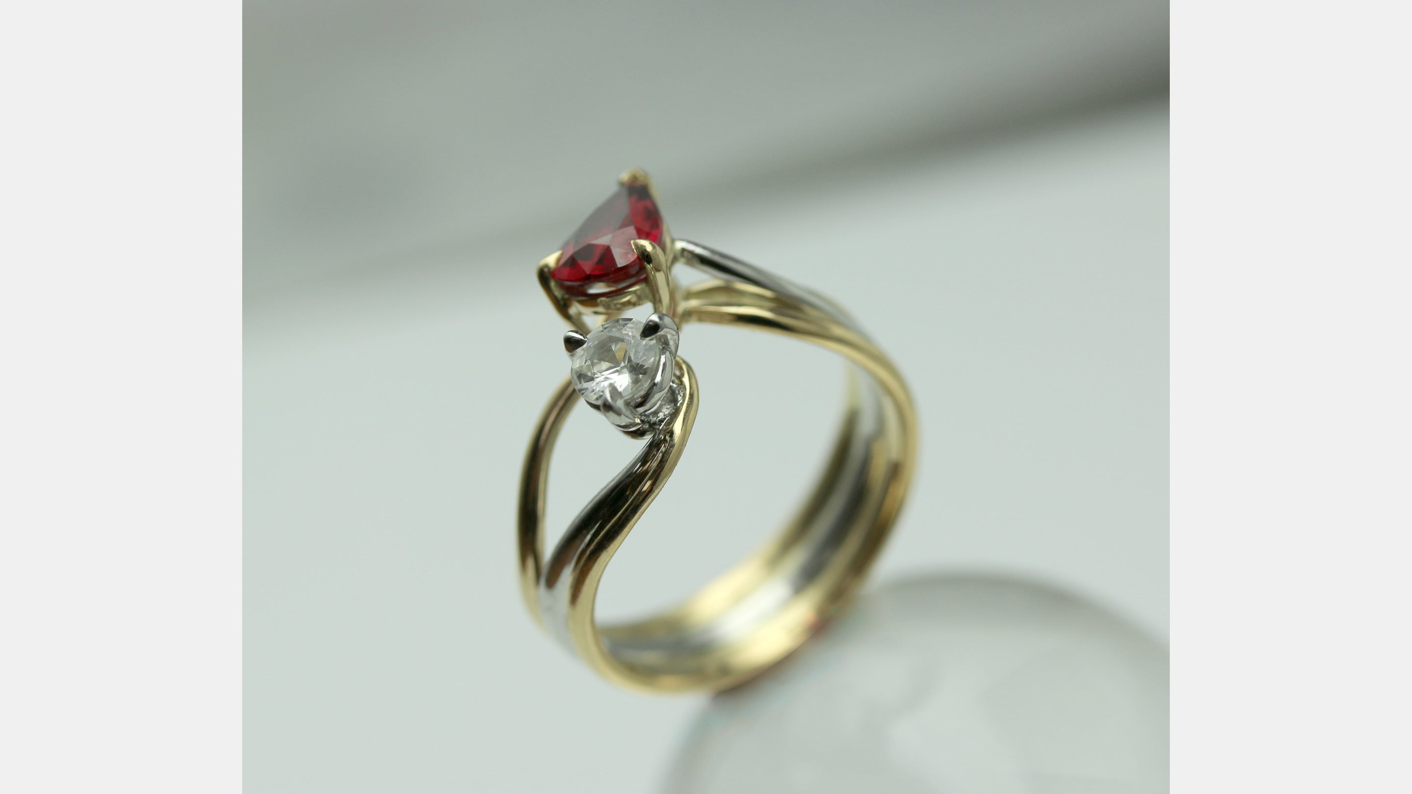 Bi metal Engagement Ring. 18KT Yellow Gold, Platinum, Mosambique Ruby, and natural White Sapphire.